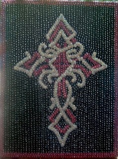 Dabei habe ich ein keltisches Kreuz ausgewählt. Das Bild ist ca. DINA4 Größe...die Hintergrundpailletten sind schwarz, das Kreuz selbst in weinrot und silber.