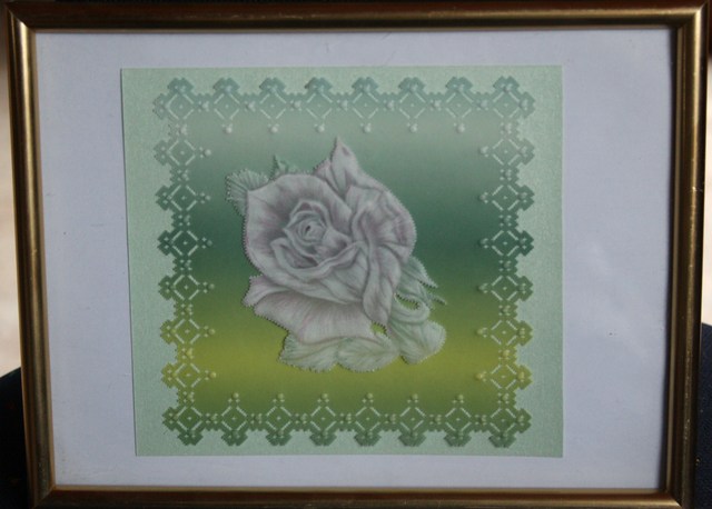 Diese Rosenblüte steht jetzt im Wohnzimmer von Helga - gearbeitet habe